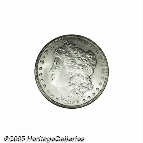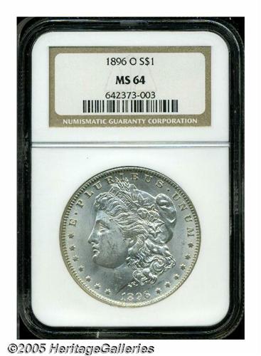 <B>1896-O<S$1> MS64 NGC.</B></I> Unlike later New Orleans issues, beginning with the 1898-O, where vast quantities of Uncirculated coins were kept in government vaults until the 1960s, no such hoards were ever found of the relatively high mintage '96-O and '97-O dollars. Add to that, the propensity for substandard strike and luster characteristics and these issues emerge as real rarities in high quality Mint State grades. This remarkably preserved example is satiny in appearance and virtually untoned. The strike is a touch sharper in the tell-tale areas than on the typical example and, save for shallow bagmarks on Liberty's cheek, surface marks are few and far between. One of only nine pieces so graded by NGC, as noted in their <I>Census Report,</B></I> with just three coins graded higher (6/05), confirming the rarity of this date in Choice Mint State.