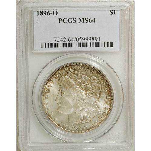 <B>1896-O S$1 MS64 PCGS.</B></I> Another Morgan dollar in this auction in memorable condition aesthetically, and near the top of the Condition Census numerically, the present piece has been exceeded by exactly a half-dozen Gem coins, namely three each at NGC and PCGS (4/07). The Bowers Morgan dollar <I>Guide Book</B></I> (2005) quotes silver dollar expert Wayne Miller concerning this issue, "No other Morgan dollar is as consistently deficient in luster, strike, and degree of surface abrasions as the 1896-O. In Miller's opinion the 1896-O is the rarest of all Morgan dollars (even more than 1901) in truly gem condition."<BR> The present coin is not a Gem, but it is one grade point below, and appears considerably high-end for the MS64 ranking assigned to it. The surfaces are brilliant, with a slight patina of silver-gold in the largely untoned centers. A thin peripheral crescent of deep amber-gold, magenta, and russet is noted on the upper obverse, while the reverse is startlingly untoned, lustrous, and brightly radiant. The sharp strike has brought up most of the detail in the eagle's breast and the individual feathers in the wings, as well as on the often-weak leaves in the wreath below the eagle. On the obverse the hair above Liberty's ear shows only minor weakness. Close examination with a loupe reveals a couple of small milling marks on Liberty's cheek, along with a larger tick behind Liberty's cap, in the right obverse field, that cumulatively help to determine the grade. Elsewhere there are few mentionable abrasions, especially on the high-end reverse.<BR> This coin represents an elusive opportunity to obtain such a significant and conditionally rare Morgan dollar for a fine set. Population: 23 in 64, 3 finer (4/07).<BR><BR><b>Shipping:</b> Coins & Currency (<a target="_blank" href="http://www.heritageauctions.com/common/shipping.php">view shipping information</a>)