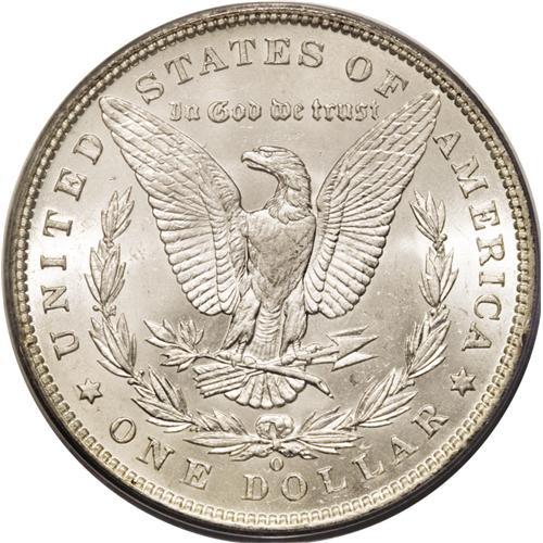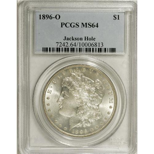 <B>1896-O S$1 MS64 PCGS.</B></I> Ex: Jackson Hole. A brilliant and lustrous near-Gem with frosty silver luster and faint champagne toning. The 1896-O is a scarce date in all Mint State grades, although it is common in circulated grades. It seems that most or all of the original mintage was actually used for its intended purpose--circulation. Accurately graded Choice and Gem Mint State examples, such as the near-Gem coin offered here, are not often encountered. Over 30 years ago, in 1976, Wayne Miller wrote: "No other Morgan dollar is as consistently deficient in luster, strike, and degree of surface abrasions at the 1896-O. A fully struck piece is rare; an 1896-O with minimum bagmarks is even more unusual." Population: 23 in 64, 3 finer (2/07).<BR><I>From The Jackson Hole Collection.</B></I><BR><BR><b>Shipping:</b> Coins & Currency (<a target="_blank" href="http://www.heritageauctions.com/common/shipping.php">view shipping information</a>)