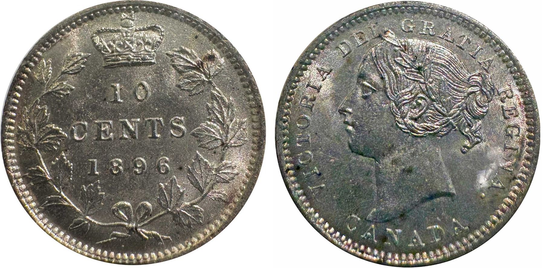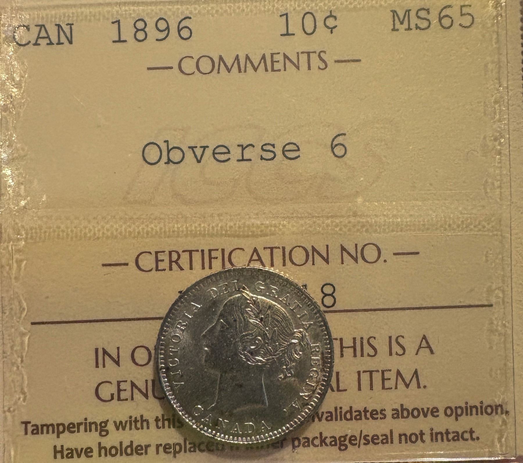 1896 "Obv 6" 10¢ ICCS Gem Mint State-65, Brilliant with lustrous ‘pop’. A rarely offered and undervalued Victorian gem.