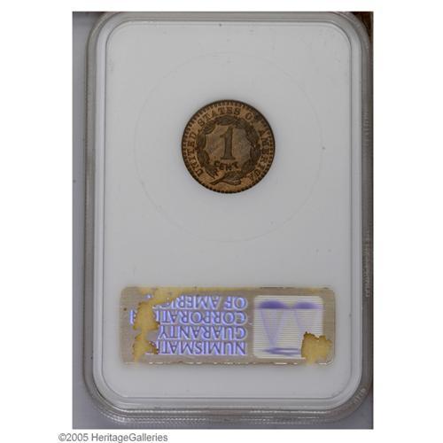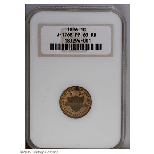 <B>1896<P1C> One Cent, Judd-1768, Pollock-1983, R.5, PR63 Red and Brown NGC.</B></I> One of just a handful of designs from the later part of the 19th century that advanced to pattern status. The obverse features a shield with thirteen stripes and a scroll inscribed LIBERTY that passes in front. Behind are two crossed poles, one bearing an eagle, the other a liberty cap. E PLURIBUS UNUM is above, 1896 is below. The reverse displays ONE CENT within a curved olive sprig with UNITED STATES OF AMERICA around. The border is beaded on both sides. Struck in bronze (several alloys) with a plain edge. The PCGS <I>Population Report</B></I> lists only proof specimens under this Judd number and we are inclined to believe that only proofs were struck. This coin's mottled glossy-brown and tan surfaces do, however, look deceptively like those of a business strike, but we leave it to the buyer to debate this coin's finish. Overall, this is an attractive specimen that is a few conspicuous carbon spots away from a finer grade.