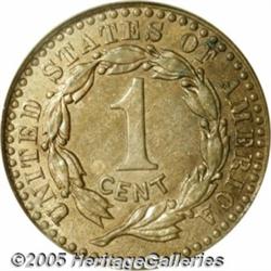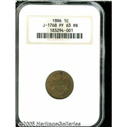 <B>1896 P1C One Cent, Judd-1768, Pollock-1983, R.5, PR63 Red and Brown NGC.</B></I> One of just a handful of designs from the later part of the 19th century that advanced to pattern status. The obverse features a shield with thirteen stripes and a scroll inscribed LIBERTY that passes in front. Behind are two crossed poles, one bearing an eagle, the other a liberty cap. E PLURIBUS UNUM is above, 1896 is below. The reverse displays ONE CENT within a curved olive sprig with UNITED STATES OF AMERICA around. The border is beaded on both sides. Struck in bronze (several alloys) with a plain edge. The PCGS <I>Population Report</B></I> lists only proof specimens under this Judd number and we are inclined to believe that only proofs were struck. This coin's mottled glossy-brown and tan surfaces do, however, look deceptively like those of a business strike, but we leave it to the buyer to debate this coin's finish. Overall, this is an attractive specimen that is a few conspicuous carbon spots away from a finer grade.