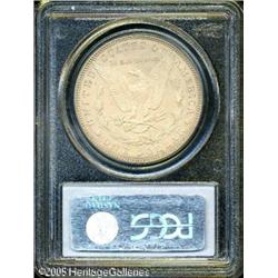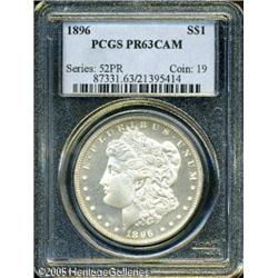 <B>1896<img border='0' src='http://www.heritagecoins.com/images/star.gif' width=10 height=10>$1 PR63 Cameo PCGS.</B></I> Fully struck with watery, deeply reflective obverse fields, and beautifully frosted obverse devices. Both sides are free of bothersome hairlines, and handling marks, but the numerical grade of the piece is limited due to a deep layer of opaque, pink-gray patina over the reverse, that obscures the reflectivity of the reverse fields. Lot:10666
