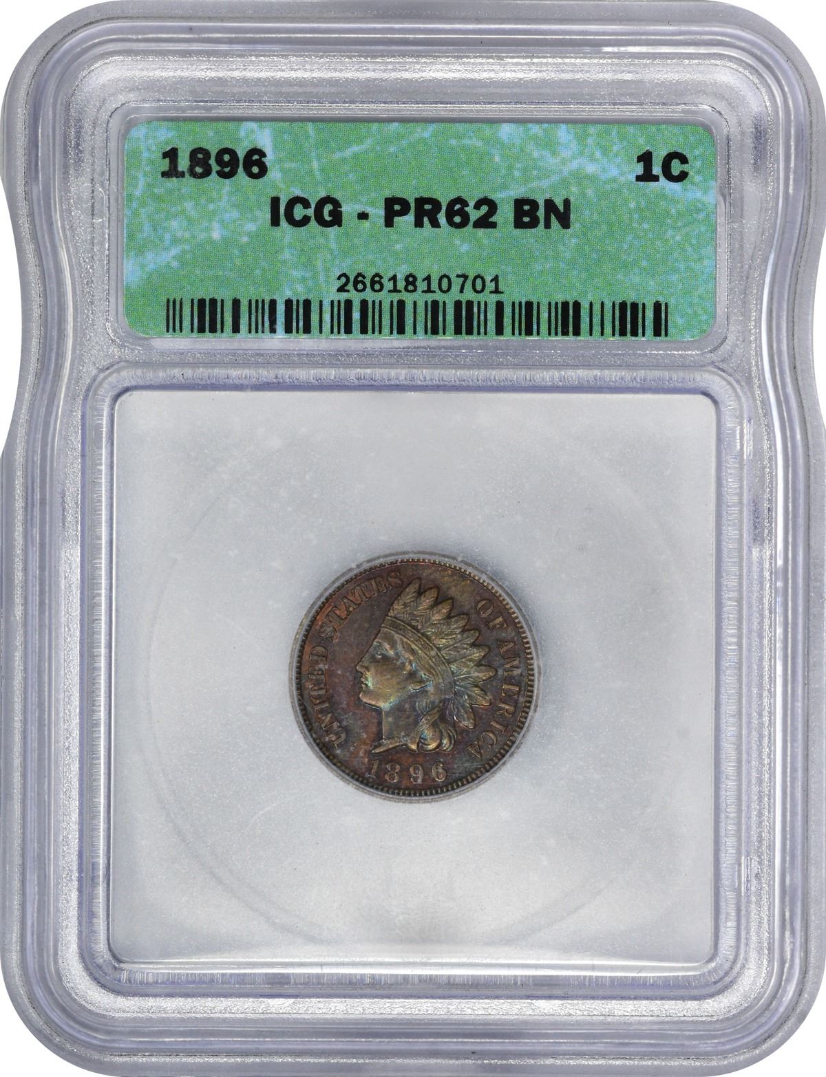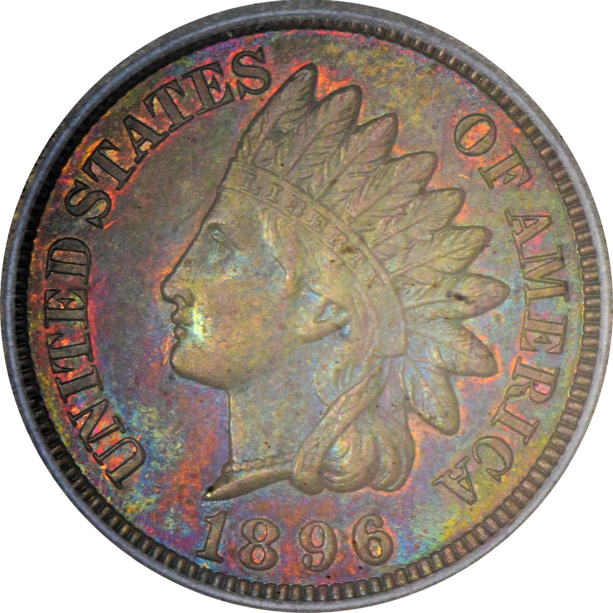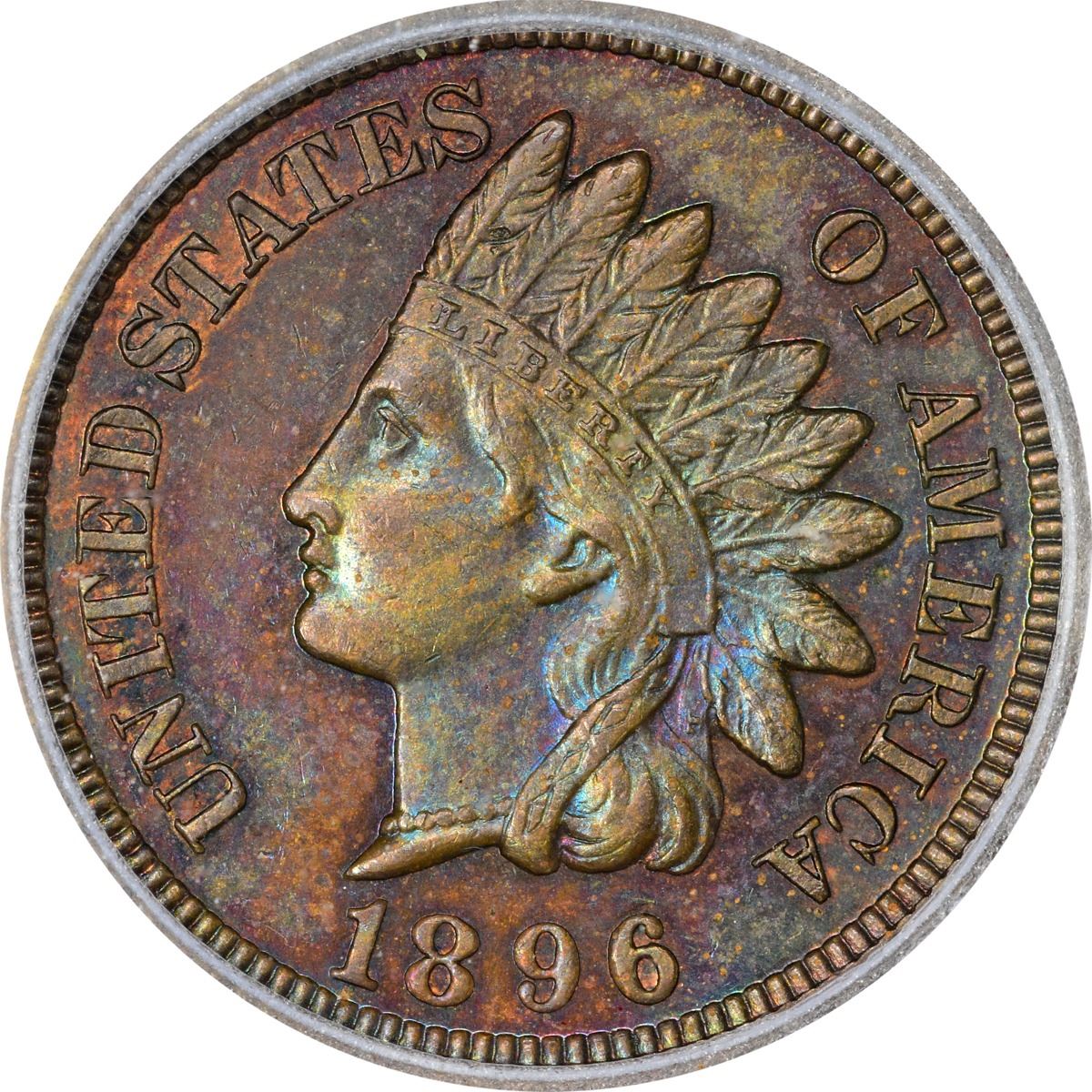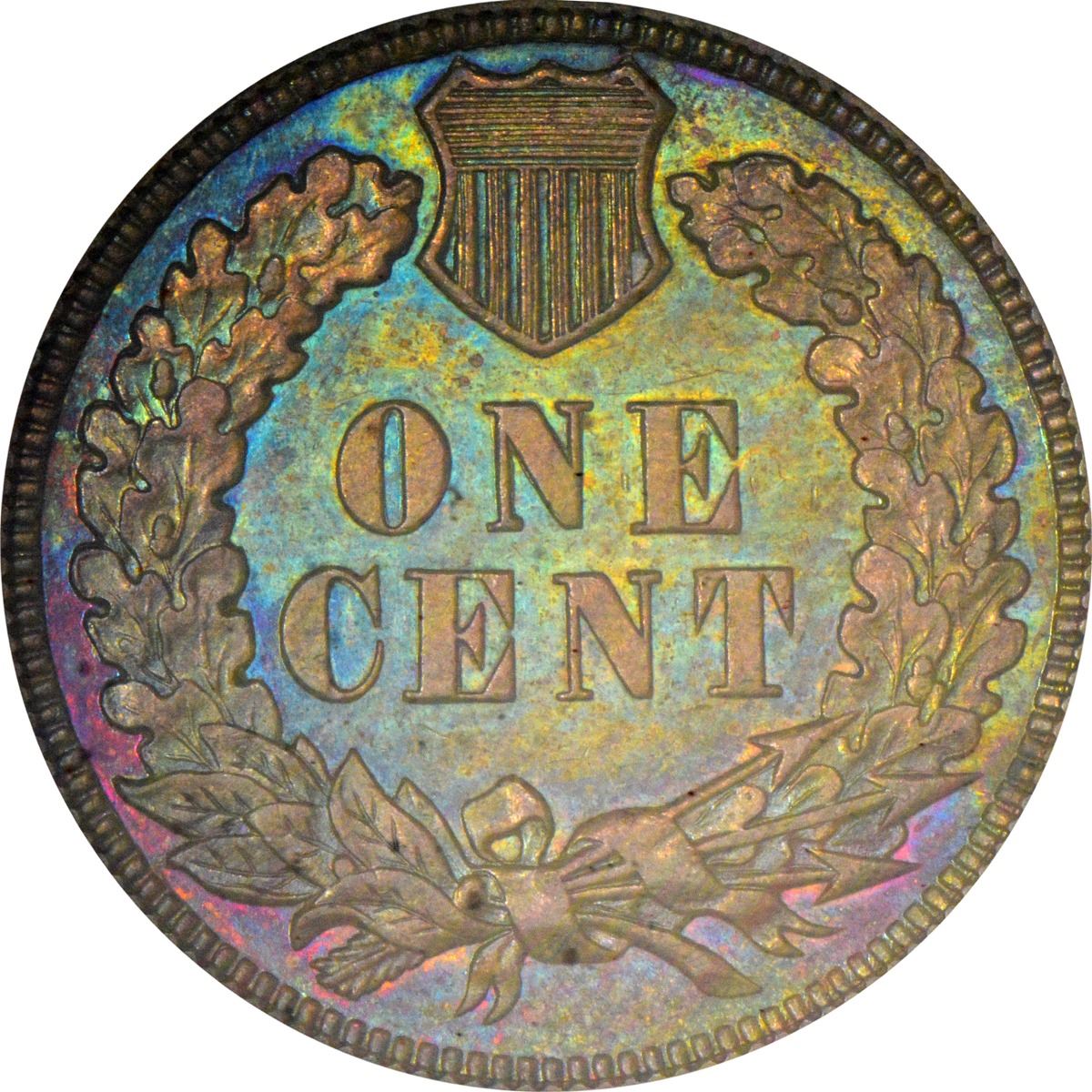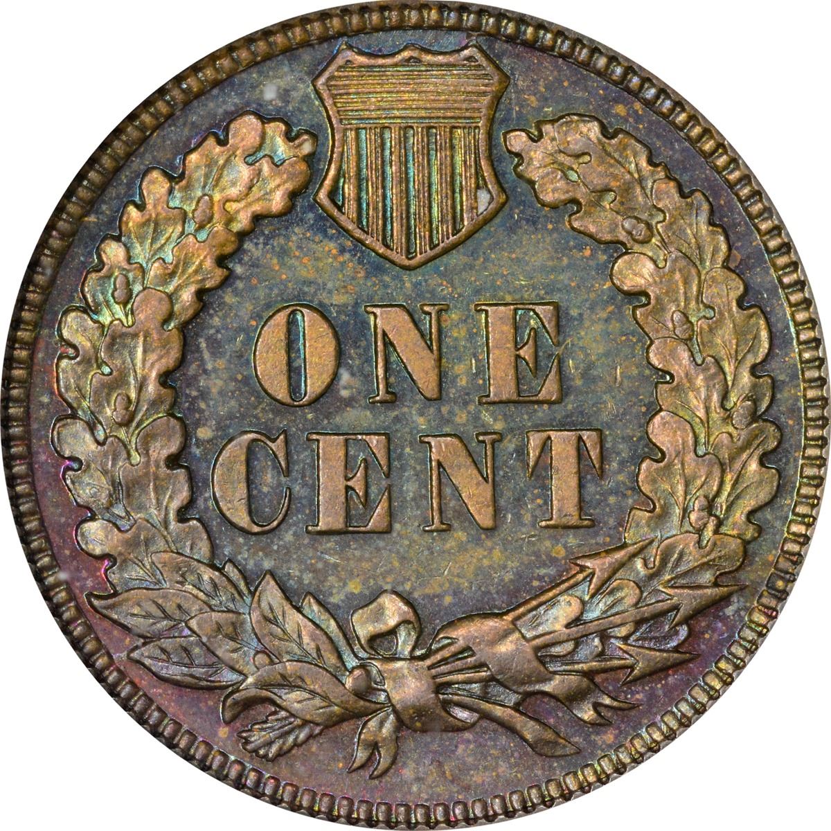 The deep chestnut-red surfaces of this Proof Indian cent yield a wealth of lively blue and smoky orange iridescence in a bold light source.