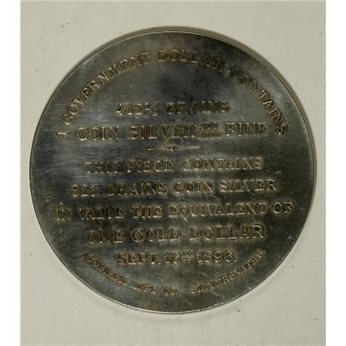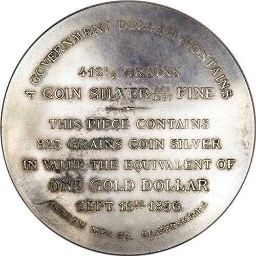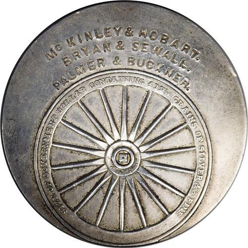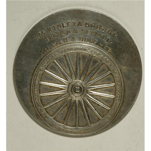 <B>1896 Rare Variety of Bryan Dollar.</B></I> HK-780. An uncertified, unlisted variety of this well-known so-called dollar. In the field above the wheel the names of the three parties running for election have been counterstamped with a single punch. This is the first one that we have seen, and it is unlisted in the 2001 catalog <I>Bryan Money</B></I> by Fred Schornstein. We believe this exciting piece will draw plenty of attention from a wide range of collectors of Bryan money, and spirited bidding is expected. The market value is approximately $1,000-$1,200.<BR><BR><b>Shipping:</b> Coin/Currency (<a target="_blank" href="http://www.heritageauctions.com/common/shipping.php">view shipping information</a>)