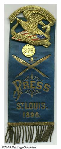 <B>1896 Republican National Convention Press Badge/Ribbon</B></I> What a beautiful and impressive display piece this would make! The Republican National Convention of 1896 was held June 16-18 in St Louis, Missouri. In a peaceful convention, William McKinley of Ohio was nominated on the first ballot and the platform supported the continuation of the gold standard. Wouldn't you love to know who originally wore Press Badge number 376? Overall size is 3" x 8.5" with an eagle, wings spread, holding a banner stating "Republican National Convention" standing on an enameled red, white, and blue American flag. The blue ribbon has two crossed quills above "PRESS / St LOUIS, 1896." Manufactured by Mermod & Jaccard's of St. Louis. Press badges from early national conventions are not at all common and this is one that could be a centerpiece in any collection. Superb condition. These massive, fancy badges are rarely seen so nice. Lot:260