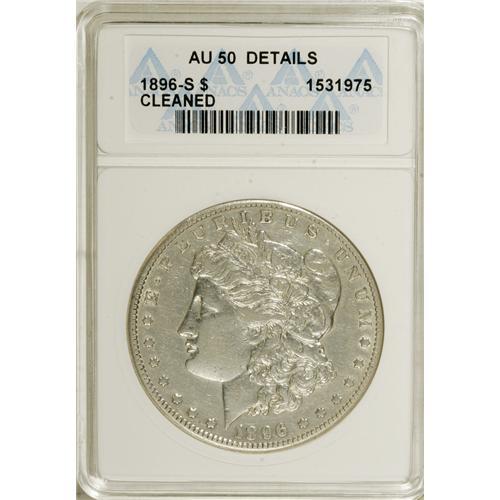 <B>1896-S $1 --Cleaned--ANACS. AU50 Details.</B></I> NGC Census: (45/663). PCGS Population (28/1289). Mintage: 5,000,000. Numismedia Wsl. Price for NGC/PCGS coin in AU50: $400. (#7244)<BR><BR><b>Shipping:</b> Coins & Currency (<a target="_blank" href="http://www.heritageauctions.com/common/shipping.php">view shipping information</a>)