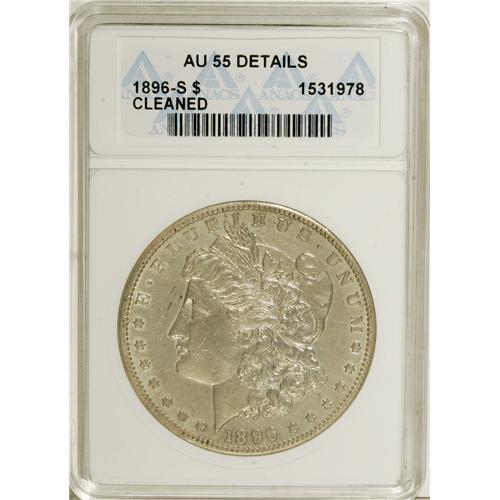<B>1896-S $1 --Cleaned--ANACS. AU55 Details.</B></I> NGC Census: (47/579). PCGS Population (25/1243). Mintage: 5,000,000. Numismedia Wsl. Price for NGC/PCGS coin in AU55: $475. (#7244)<BR><BR><b>Shipping:</b> Coins & Currency (<a target="_blank" href="http://www.heritageauctions.com/common/shipping.php">view shipping information</a>)