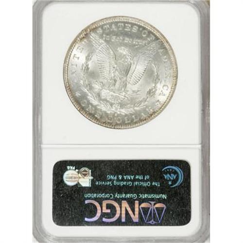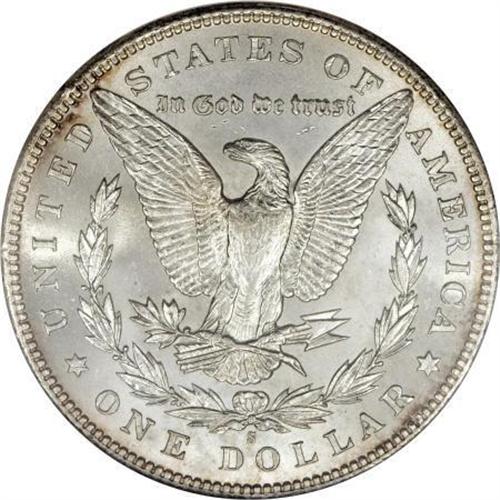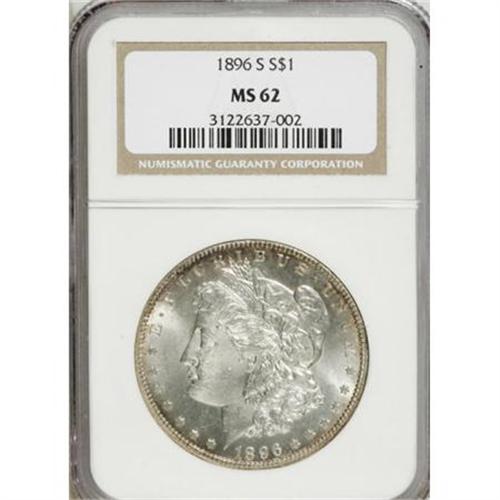 <B>1896-S $1 MS62 NGC.</B></I> The 1896-S dollar, from a mintage of 5 million pieces, saw 2 to 3 million coins melted under the Pittman Act. While the issue is common in low grades, it is very desirable in any Mint State grade. Wisps of purple color visit the peripheries of this MS62 example, and bright surfaces reveals no more than a few minuscule marks. Typically struck on the design elements.<BR><BR><B>Coin Engraver:</B> George T. Morgan<BR><BR><b>Shipping:</b> Coins & Currency (<a target="_blank" href="http://www.heritageauctions.com/common/shipping.php">view shipping information</a>)