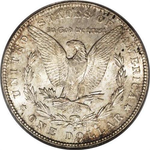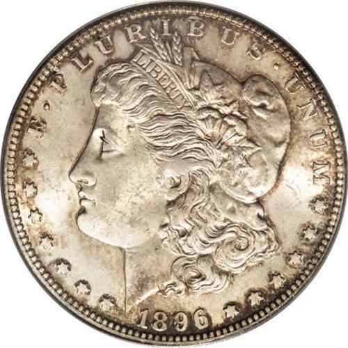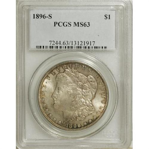 <B>1896-S $1 MS63 PCGS.</B></I> An elusive S-mint issue from the 1890s. Deep amber-gold and iridescent cobalt-blue grace the rims of this otherwise silver-gray and gold piece, which boasts moderate luster under the light layer of color. The soft strike on the highpoint hair reveals a few roller marks there, and the eagle's breast is somewhat soft as well. This example, however, shows good eye appeal, with only a few light abrasions consistent with the Select grade.<BR><BR><B>Coin Engraver:</B> George T. Morgan<BR><BR><b>Shipping:</b> Coins & Currency (<a target="_blank" href="http://www.heritageauctions.com/common/shipping.php">view shipping information</a>)