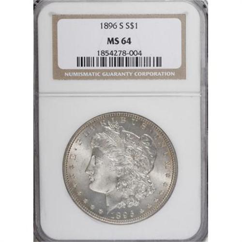 <B>1896-S $1 MS64 NGC.</B></I> According to Wayne Miller, the 1896-S Morgan dollar is very scarce in Uncirculated condition, despite a high mintage of 5,000,000 pieces. This near-Gem example is well struck and lustrous, with smoky plum-gray toning in the fields and light golden accents at the peripheries. A couple of small milling marks on Liberty's portrait limit the grade. <BR><I>From The Silver Fox Collection.</B></I><BR><BR><b>Shipping:</b> Coins & Currency (<a target="_blank" href="http://www.heritageauctions.com/common/shipping.php">view shipping information</a>)