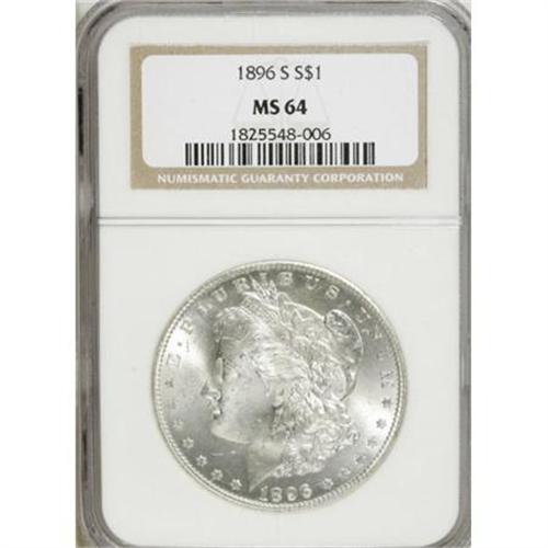 <B>1896-S $1 MS64 NGC.</B></I> Lustrous and flashy surfaces display just a touch of light gold tone. Planchet roller marks near Liberty's eye and well-concealed within her hair are not to be confused with abrasions as they are mint-made. The 1896-S is very desirable in all Mint State grades. The typical example is apt to be in the MS60 to MS63 range. <BR><I>From The Motor City Collection.</B></I><BR><BR><B>Coin Engraver:</B> George T. Morgan<BR><BR><b>Shipping:</b> Coins & Currency (<a target="_blank" href="http://www.heritageauctions.com/common/shipping.php">view shipping information</a>)
