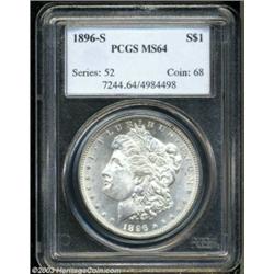 <table><tr><td><TABLE cellSpacing=0 cellPadding=0 width="100%" bgColor=#000000 border=0><TBODY> <TR><TD width="100%"><TABLE cellSpacing=1 cellPadding=3 width="100%" border=0><TBODY><TR><TD width="100%" bgColor=#79735c><FONT face=arial color=#ffffff size=3><B>Description</B> </FONT></TD></TR><TR><TD width="100%" bgColor=#ffffff><FONT face=arial size=2><B>1896-S $1 MS64 PCGS.</B></I> Even though 5 million pieces were struck of the 1896-S Dollar, and it is a common issue in circulated grades, there are very few Mint State examples known. Obviously, the vast majority of this issue was placed into circulation by the turn of the century. This piece has lovely satin-like luster with the usual softness of strike in the centers. Untoned overall, there are just a few light abrasions on each side that accounts for the less-than-Gem grade.<BR><I>From the Holman Family Collection.</B></I> </FONT></TD></TR></TBODY></TABLE></TD></TR></TBODY></TABLE><BR><A name=PricesRealized></A><TABLE cellSpacing=0 cellPadding=0 width="100%" bgColor=#000000 border=0><TBODY><TR><TD width="100%"><TABLE cellSpacing=1 cellPadding=3 width="100%" border=0><TBODY><TR><TD width="100%" bgColor=#79735c><A name=PR><FONT face=arial color=#ffffff size=3><B>Previous Prices from Heritage Auctions</B> </FONT></A></TD></TR><TR><TD bgColor=#f6f6ed><TABLE cellSpacing=0 cellPadding=0 width="100%" border=1><TBODY><TR><TD align=middle width="33%"><B>Date</B></TD><TD align=middle width="33%"><B>Service</B></TD><TD align=middle width="33%"><B>Price</B></TD></TR><TR bgColor=whitesmoke><TD width="33%"><B>07/22/2003</B></TD><TD width="33%">PCGS</TD><TD width="33%">$1,955.00</TD></TR><TR bgColor=whitesmoke><TD width="33%"><B>06/18/2002</B></TD><TD width="33%">PCGS</TD><TD width="33%">$1,955.00</TD></TR><TR bgColor=whitesmoke><TD width="33%"><B>12/25/2001</B></TD><TD width="33%">PCGS</TD><TD width="33%">$1,950.00</TD></TR><TR bgColor=whitesmoke><TD width="33%"><B>08/06/2003</B></TD><TD width="33%">PCGS</TD><TD width="33%">$2,127.50</TD></TR><TR bgColor=whitesmoke><TD width="33%"><B>01/11/2003</B></TD><TD width="33%">PCGS</TD><TD width="33%">$2,875.00</TD></TR><TR bgColor=whitesmoke><TD width="33%"><B>11/23/2002</B></TD><TD width="33%">PCGS</TD><TD width="33%">$1,955.00</TD></TR><TR bgColor=whitesmoke><TD width="33%"><B>01/12/2002</B></TD><TD width="33%">PCGS</TD><TD width="33%">$1,782.50</TD></TR><TR bgColor=whitesmoke><TD width="33%"><B>10/06/2001</B></TD><TD width="33%">PCGS</TD><TD width="33%">$1,840.00</TD></TR><TR bgColor=whitesmoke><TD width="33%"><B>01/05/2001</B></TD><TD width="33%">NGC</TD><TD width="33%">$1,437.50</TD></TR><TR bgColor=whitesmoke><TD width="33%"><B>02/11/2000</B></TD><TD width="33%">PCGS</TD><TD width="33%">$1,955.00</TD></TR><TR bgColor=whitesmoke><TD width="33%"><B>11/18/1999</B></TD><TD width="33%">PCGS</TD><TD width="33%">$2,098.75</TD></TR><TR bgColor=whitesmoke><TD width="33%"><B>02/12/1999</B></TD><TD width="33%">PCGS</TD><TD width="33%">$2,645.00</TD></TR><TR bgColor=whitesmoke><TD width="33%"><B>03/21/1998</B></TD><TD width="33%">PCGS</TD><TD width="33%">$2,645.00</TD></TR><TR bgColor=whitesmoke><TD width="33%"><B>06/01/1996</B></TD><TD width="33%">NGC</TD><TD width="33%">$1,760.00</TD></TR><TR bgColor=whitesmoke><TD width="33%"><B>03/04/1995</B></TD><TD width="33%">PCGS</TD><TD width="33%">$2,310.00</TD></TR><TR bgColor=whitesmoke><TD width="33%"><B>04/08/1994</B></TD><TD width="33%">NGC</TD><TD width="33%">$1,540.00</TD></TR><TR bgColor=whitesmoke><TD width="33%"><B>06/01/1996</B></TD><TD width="33%">NGC</TD><TD width="33%">$1,650.00</TD></TR><TR bgColor=whitesmoke><TD width="33%"><B>11/01/1999</B></TD><TD width="33%">PCGS</TD><TD width="33%">$1,210.00</TD></TR><TR bgColor=whitesmoke><TD width="33%"><B>04/01/1999</B></TD><TD width="33%">PCGS</TD><TD width="33%">$3,905.00</TD></TR><TR bgColor=whitesmoke><TD width="33%"><B>02/01/2000</B></TD><TD width="33%">PCGS</TD><TD width="33%">$1,840.00</TD></TR><TR bgColor=whitesmoke><TD width="33%"><B>02/16/2000</B></TD><TD width="33%">PCGS</TD><TD width="33%">$2,063.00</TD></TR><TR bgColor=whitesmoke><TD width="33%"><B>02/18/2002</B></TD><TD width="33%">PCGS</TD><TD width="33%">$1,897.00</TD></TR></TBODY></TABLE></TD></TR><TR><TD bgColor=#ffffff><FONT face=arial size=1 ?>PLEASE NOTE: All prices realized reflect the final hammer price PLUS the buyer's premium in auctions that charge a buyer's premium. Each item has a notation at the top of the listing indicating whether that lot included a buyer's premium. Example: A item that sells with a final hammer price of $100 and a 20% buyer's premium will display with a price realized of $120. All information listed is intended to be as accurate as possible, but errors are possible. Please use this guide carefully and inform us of any inaccuracies. </FONT></TD></TR></TBODY></TABLE></TD></TR></TBODY></TABLE><BR><TABLE cellSpacing=0 cellPadding=0 width="100%" bgColor=#000000 border=0><TBODY><TR><TD width="100%"><TABLE cellSpacing=1 cellPadding=3 width="100%" border=0><TBODY><TR><TD width="100%" bgColor=#79735c colSpan=6><FONT face=arial color=#ffffff size=3><B>Price Guide*</B> </FONT></TD></TR><TR bgColor=#f6f6ed><TD align=middle><B>Grade</B> </TD><TD align=middle><B>Coin World<BR>(Trends)</B> </TD><TD align=middle><B>Numismedia<BR>Retail</B> </TD><TD align=middle><B>Numismedia<BR>Wholesale</B> </TD><TD align=middle><B>Coin<BR>Universe</B> </TD><TD align=middle><B>Heritage<BR>Value Index</B> </TD></TR><TR bgColor=#ffffff><TD align=middle>63</TD><TD align=right>$1,800.00</TD><TD align=right>---</TD><TD align=right>$1,325.00</TD><TD align=right>$1,875.00</TD><TD align=right>$1,282.38</TD></TR><TR style="FONT-WEIGHT: bold" bgColor=#cccfdd><TD align=middle>64</TD><TD align=right>$3,000.00</TD><TD align=right>---</TD><TD align=right>$2,225.00</TD><TD align=right>$3,000.00</TD><TD align=right>$2,031.88</TD></TR><TR bgColor=#ffffff><TD align=middle>65</TD><TD align=right>$15,000.00</TD><TD align=right>---</TD><TD align=right>$12,250.00</TD