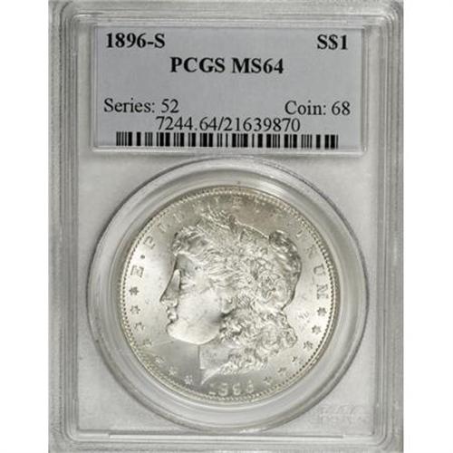 <B>1896-S $1 MS64 PCGS.</B></I> The 1896-S is very desirable in all Mint State grades. The typical example is apt to be in the MS60 to MS63 range. Vibrant luster adorns the essentially untoned surfaces of this near-Gem, and an attentive strike brings out good detail on most of the design elements. A handful of obverse marks define the grade.<BR><I>From The Arnold & Harriet Collection, Part Two.</B></I><BR><BR><B>Coin Engraver:</B> George T. Morgan<BR><BR><b>Shipping:</b> Coins & Currency (<a target="_blank" href="http://www.heritageauctions.com/common/shipping.php">view shipping information</a>)