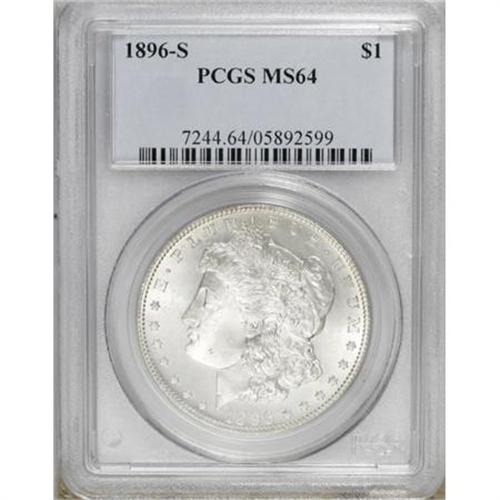 <B>1896-S $1 MS64 PCGS.</B></I> Choice quality with highly lustrous and brilliant silver surfaces. Although not as rare as O-mint dollars from this period, the '96-S is an important key in the Morgan dollar series. PCGS has only certified 44 finer examples of the date in over 20 years of rare coin certification.<BR><BR><B>Coin Engraver:</B> George T. Morgan<BR><BR><b>Shipping:</b> Coins & Currency (<a target="_blank" href="http://www.heritageauctions.com/common/shipping.php">view shipping information</a>)