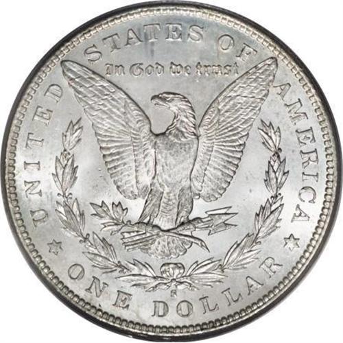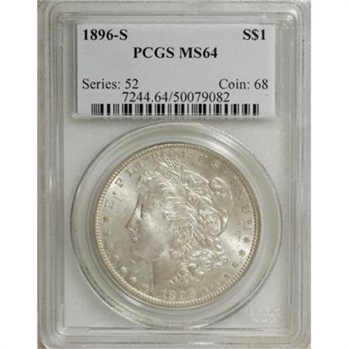 <B>1896-S $1 MS64 PCGS.</B></I> A splendid piece with brilliant silver luster and frosty surfaces. Both sides are very nearly mark-free, with a few entirely inconsequential surface nicks. The eye appeal of this piece is equal to many that are called Gem. PCGS has only certified 44 finer examples of the date (1/08).<BR><I>From The Jimmy G. PCGS Registry Collection of Morgan Dollars with Varieties.</B></I><BR><BR><B>Coin Engraver:</B> George T. Morgan<BR><BR><b>Shipping:</b> Coins & Currency (<a target="_blank" href="http://www.heritageauctions.com/common/shipping.php">view shipping information</a>)