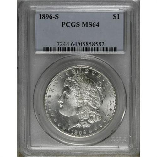 <B>1896-S $1 MS64 PCGS.</B></I> Like the 1896-O dollar, the '96-S is a condition rarity that is generally easy to locate in circulated grades, but elusive in Mint State grades. This Choice piece is fully brilliant and untoned with frosty silver luster on each side. PCGS has graded just 45 better ones in over two decades of coin certification.<BR><BR><B>Coin Engraver:</B> George T. Morgan<BR><BR><b>Shipping:</b> Coins & Currency (<a target="_blank" href="http://www.heritageauctions.com/common/shipping.php">view shipping information</a>)