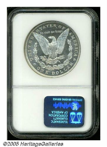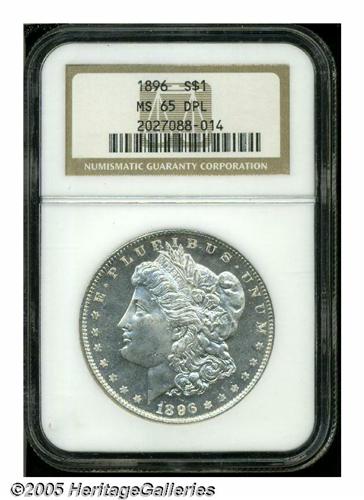 <B>1896<S$1> MS65 Deep Mirror Prooflike NGC.</B></I> VAM-1A. A Hot 50 Variety. The curious 'Bar 6' variety, once regarded as an 1896/4 variety by Breen (Breen-5645). A brilliant Gem, the nicely frosted devices are crisply struck and display modest contrast with the mirrored fields.