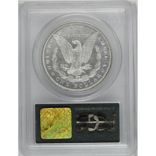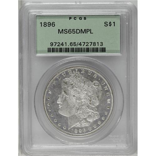 <B>1896<img border='0' src='http://www.heritagecoins.com/images/star.gif' width=10 height=10>$1> MS65 Deep Mirror Prooflike PCGS.</B></I> Imposing reflectivity and a crisp strike are attributes of this nearly brilliant Gem. A single minute speck of PVC is found on the field beneath the beak. Certified in a green label holder.