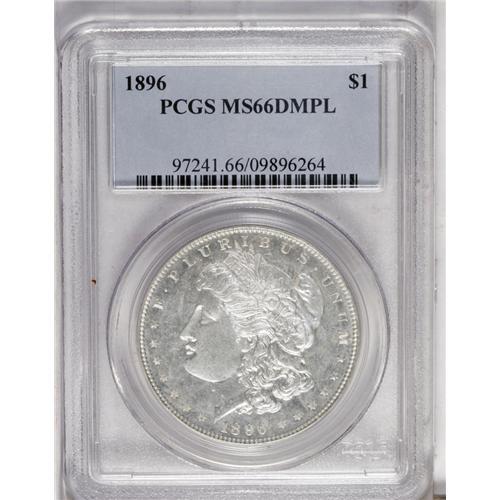 <B>1896 S$1 MS66 Deep Mirror Prooflike PCGS.</B></I> After years of declining mintages, Philadelphia produced close to 10 million silver dollars in 1896. As one might expect, these are common up to the MS65 level. Deep Mirror pieces are substantially scarcer, but nearly all are in MS62 to MS65 grades. At the MS66 level, the 1896 is more rare as a DMPL business strike than as a proof. This well struck and nearly untoned example is remarkably well preserved, and betrays its commercial origins only on the obverse dentils, which slope toward the fields. Population: 10 in 66 Deep Mirror Prooflike, 0 finer (10/06).<BR><BR><b>Shipping:</b> Coin/Currency (<a target="_blank" href="http://www.heritageauctions.com/common/shipping.php">view shipping information</a>)