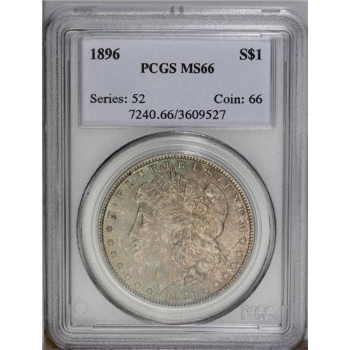 <B>1896<img border='0' src='http://www.heritagecoins.com/images/star.gif' width=10 height=10>$1> MS66 PCGS.</B></I> A delightful Gem draped with dusty-gold and blue toning. Highly lustrous with exceptional design details.<BR><I>From The David L. Goodwin Collection.</B></I> <BR><BR><B>Important notice:</B> Heritage usually auctions material at the rate of 200-250 lots per hour. On some occasions eBay Live bid software or the Internet may not be able to keep up with the pace of the auction. We recommend placing a realistic absentee bid now as insurance to avoid disappointment. Occasionally the auctioneer may eliminate or reject an eBay Live bid, and the auctioneer may also reopen a lot after the close of the eBay live bidding (usually because we missed an audience bid), and may reject your bid even if it shows you as the winning bidder. By bidding via eBay Live, you agree that Heritage may award the lot to another bidder at its sole discretion under the circumstances described above or any other reasonable circumstances. Since eBay bids are not shown to us until we open the lot on the floor, we treat those bids just like floor bids. In most cases the floor responds before the eBay bid is presented to us, due to Internet lag time, so for consistency we have made it a policy that floor bids are always considered first over tie eBay live bids. Also please note that all Heritage lots purchased through eBay Live carry a 20% Buyer's Premium. Please make sure you read the Terms and Conditions before you bid. This lot is being auctioned in conjunction with a live floor auction by Heritage Galleries & Auctioneers. All final auction and invoice information will be supplied by Heritage Galleries & Auctioneers, and all other information should be considered preliminary. Lot:3698 <BR><BR><B>Winning Notification and Billing:</B> After the FINAL session in this auction is complete, Heritage will send e-mail and snail mail invoices. This process normally takes several days. All final auction and invoice information will be supplied by Heritage Galleries & Auctioneers, and all other information should be considered preliminary. <BR><BR>This auction will be conducted on a live auction floor and over the Internet through eBay Live. If you choose to place an absentee bid, please take a moment to <font color='#0000ff'><u><a href='http://pages.ebay.com/liveauctions/help/before/laabsentee.html'>learn how eBay Live absentee bidding works</a></u></font><font color='#000000'>