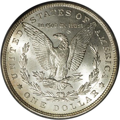 <B>1896<img border='0' src='http://www.heritagecoins.com/images/star.gif' width=10 height=10>$1> MS67 ICG.</B></I> Lovely electric-blue, plum-red, and peach dominate the obverse. The reverse is only faintly toned gray and chestnut. This lustrous and magnificently smooth Superb Gem has delightful eye appeal. After four years of low mintages, the Philadelphia Mint returned to full production for the 1896 Morgan Dollar.