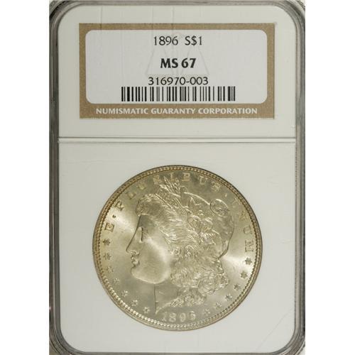 <B>1896 S$1 MS67 NGC.</B></I> A light golden cast is noted on the obverse, while the reverse is largely brilliant, but both sides are blessed by intense and highly attractive cartwheel luster. Liberty's cheek is exceptionally clean, and the strike is as bold as the surfaces are lovely. Census: 43 in 67, 0 finer (4/07).<BR><BR><b>Shipping:</b> Coins & Currency (<a target="_blank" href="http://www.heritageauctions.com/common/shipping.php">view shipping information</a>)