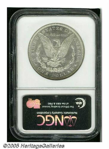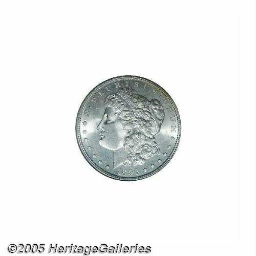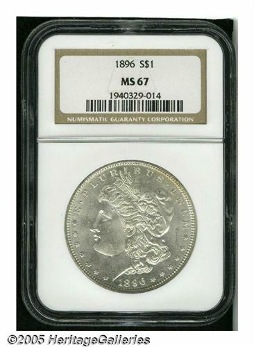 <B>1896<S$1> MS67 NGC.</B></I> VAM-3, R.4. Light recutting is noted on the lower loops of the 89 in the date. A gorgeous and essentially brilliant Superb Gem, crisply struck and lovingly undisturbed. The 1896 is among the more available Philadelphia Mint issues from the later half of the series, but becomes a formidable condition rarity at the MS67 level. In fact, neither NGC nor PCGS has certified an example in a higher grade, although PCGS has encapsulated a single piece as MS67 Prooflike. Population: 28 in 67, 0 finer (6/05).