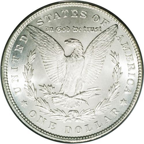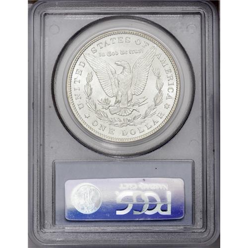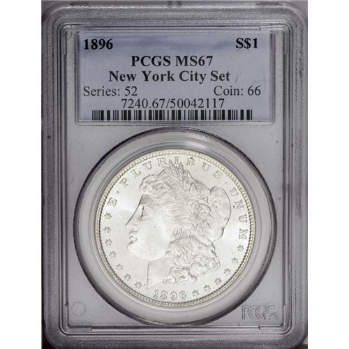 <B>1896<img border='0' src='http://www.heritagecoins.com/images/star.gif' width=10 height=10>$1> MS67 PCGS.</B></I> Ex: New York City Set. Starting in 1896, Morgan Dollar production returned to pre-1893 levels. With the sole exception of the 1899, every issue from 1896 through 1921 would have a mintage of more than 1 million coins. As an issue, the high mintage (9.9 million pieces) 1896 is among the more common Morgan Dollars on today's market. Circulated examples abound, and even Gems are obtainable for a modest sum. Above the MS66 grade level, however, the 1896 develops into a true condition rarity. Uncommonly smooth for the issue, this untoned specimen is free of both bothersome striking softness and distracting abrasions. The surfaces are richly frosted from rim to rim. Population: 23 in 67, 0 finer (1/06).<BR><I>From The Michael Casper Collection, Part Three.</B></I>