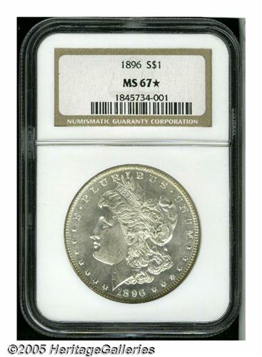 <B>1896<S$1> MS67 <S NGC.</B></I> While "a common coin in uncommon condition" may sometimes be an overused expression when describing coins, it certainly is an apt description of this coin. The 1896 is just not a later-date that is seen very often in Superb condition. This is one of only three coins that have been given the <S designation by NGC with none finer (6/05). This is a brilliant coin that shows flashy mint luster with a hint of reflectivity in the fields. Well, but not fully struck, there are no notable abrasions on either side of this intensely lustrous and attractive dollar.