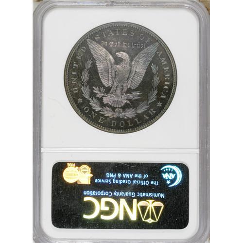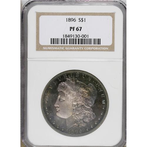 <B>1896 S$1 PR67 NGC.</B></I> The 1896 proof dollar is among the best produced of all Morgans, along with the 1882 and 1898. The mintage of 762 pieces, and the high quality of survivors translates into the use of this date for those assembling a proof type set of 19th century U.S. coins. This piece is undoubtedly destined for such a high grade type set. The fields display unfathomable depth of mirrored reflectivity. There is also a significant amount of mint frost over the devices, which sets up a moderate (but unacknowledged by PCGS) contrast on each side. This is significant because the coin is draped in rich layers of cobalt blue and lavender toning. The surfaces are extraordinarily well preserved with no hairlines or noticeable contact marks. A couple of lint marks are located in the left obverse field, but magnification is necessary to see them. Census: 20 in 67, 7 finer (3/07).<BR><BR><b>Shipping:</b> Coins & Currency (<a target="_blank" href="http://www.heritageauctions.com/common/shipping.php">view shipping information</a>)