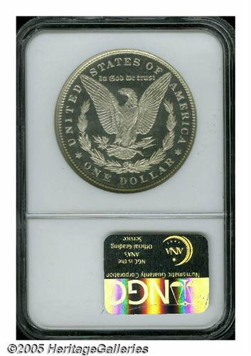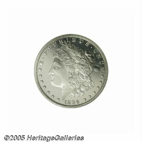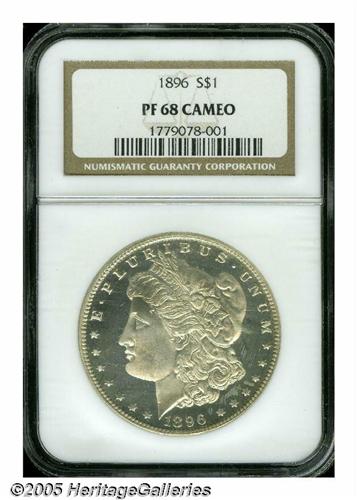 <B>1896<S$1> PR68 Cameo NGC.</B></I> There are two dates from the 1890s that seem to consistently have been preserved in better condition and show better overall eye appeal than any others, 1896 and 1898. This piece was certainly the beneficiary of such preservation. As one might infer from the grade, the surfaces are virtually perfect. Examination with a magnifier reveals a couple of very thin diagonal slide marks on Liberty's cheek, but these have no effect on the overall presentation or grade of this magnificent proof Dollar. Pale golden patina throughout, the fields are deeply mirrored and the devices heavily frosted with a two-toned contrast that is immediately evident to even the most casual viewer. A splendid and virtually unimprovable proof type coin. Population: 4 in 68 Cameo, none are finer (6/05).