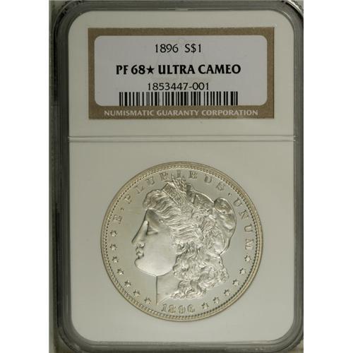 <B>1896 S$1 PR68 <img border='0' src='http://www.heritagecoins.com/images/star.gif' width=10 height=10> Ultra Cameo NGC.</B></I> After several years of sparse P-mint emissions, the Morgan dollar came roaring back in 1896, to the tune of nearly 10 million business strikes, along with about 5 million pieces each in New Orleans and San Francisco. The proof mintage was typical for the era, at 762 specimens. The 20 million examples of the 1896 Morgan dollar joined the hundreds of millions of earlier Morgan dollars in Treasury vaults, unwanted by the public, unneeded in commerce, undesired by the government, yet mandated by the inflexible terms of the Bland-Allison Act of 1878, a sop to the Western mining interests and domestic banks that had grown considerably in power in the intervening years since the "Crime of '73."<BR> The year 1896 was notable for another event in the life of the Morgan dollar (or the Bland dollar, as it was almost universally called throughout its lifetime). 1896 was the year that Miss Anna Williams, the model for the head of Liberty on the coin, married her husband. Mint Director Henry Richard Linderman, who was of the opinion that U.S. coinage designs were unacceptable, offered designer George T. Morgan, an Englishman and former student of A.B. Wyon, a job as assistant engraver at the Philadelphia Mint in 1876, although both Mint Chief Engraver William Barber and his son Charles strongly--and unsurprisingly--resisted the appointment. Morgan came to America that same year and was enlisted to design a new silver dollar. His friends directed him toward the classic beauty of Miss Williams, and when he first approached her, like most proper ladies of the time, she immediately turned him down. <I>Her</B></I> friends interceded, however, and she relented, agreeing to pose. Apparently Miss Williams "kept her looks" well, as she married nearly 20 years later, in 1896!<BR> The year 1896 was an especially kind one for Morgan dollar proofs, and for this particular specimen as well. While only a couple of dozen proofs have been certified as fine as this piece at NGC, that service has certified five 1896 dollars in PR68 Star Ultra Cameo, including the present example, with two coins finer (11/06). The coin is brilliant silver-white, without detectable patina, and stunning silver-on-black, deeply contrasting surfaces. Perusal even under a loupe reveals only surface minutiae unworthy of singular mention. Simply a phenomenal and phenomenally attractive piece.<BR><BR><b>Shipping:</b> Coin/Currency (<a target="_blank" href="http://www.heritageauctions.com/common/shipping.php">view shipping information</a>)