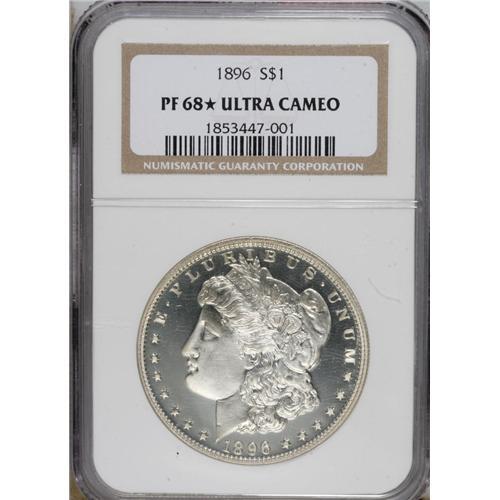 <B>1896 S$1 PR68 <img border='0' src='http://www.heritagecoins.com/images/star.gif' width=10 height=10> Ultra Cameo NGC.</B></I> After several years of sparse P-mint emissions, the Morgan dollar came roaring back in 1896, to the tune of nearly 10 million business strikes, along with about 5 million pieces each in New Orleans and San Francisco. The proof mintage was typical for the era, at 762 specimens. The 20 million examples of the 1896 Morgan dollar joined the hundreds of millions of earlier Morgan dollars in Treasury vaults, unwanted by the public, unneeded in commerce, undesired by the government, yet mandated by the inflexible terms of the Bland-Allison Act of 1878, a sop to the Western mining interests and domestic banks that had grown considerably in power in the intervening years since the "Crime of '73."<BR> The year 1896 was notable for another event in the life of the Morgan dollar (or the Bland dollar, as it was almost universally called throughout its lifetime). 1896 was the year that Miss Anna Williams, the model for the head of Liberty on the coin, married her husband. Mint Director Henry Richard Linderman, who was of the opinion that U.S. coinage designs were unacceptable, offered designer George T. Morgan, an Englishman and former student of A.B. Wyon, a job as assistant engraver at the Philadelphia Mint in 1876, although both Mint Chief Engraver William Barber and his son Charles strongly--and unsurprisingly--resisted the appointment. Morgan came to America that same year and was enlisted to design a new silver dollar. His friends directed him toward the classic beauty of Miss Williams, and when he first approached her, like most proper ladies of the time, she immediately turned him down. <I>Her</B></I> friends interceded, however, and she relented, agreeing to pose. Apparently Miss Williams "kept her looks" well, as she married nearly 20 years later, in 1896.<BR> The year 1896 was an especially kind one for Morgan dollar proofs, and for this particular specimen as well. While only a couple of dozen proofs have been certified as fine as this piece at NGC, that service has certified four 1896 dollars in PR68 Star Ultra Cameo, including the present example, with three coins finer (3/07). The coin is brilliant silver-white, without detectable patina, and stunning silver-on-black, deeply contrasting surfaces. Perusal even under a loupe reveals only surface minutiae unworthy of singular mention. Simply a phenomenal and phenomenally attractive piece.<BR><BR><b>Shipping:</b> Coins & Currency (<a target="_blank" href="http://www.heritageauctions.com/common/shipping.php">view shipping information</a>)