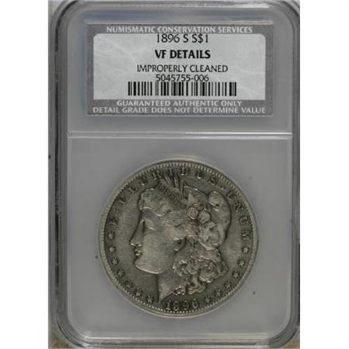 <B>1896-S $1 --Improperly Cleaned--NCS. VF Details.</B></I> NGC Census: (9/948). PCGS Population (28/1669). Mintage: 5,000,000. Numismedia Wsl. Price for NGC/PCGS coin in VF20: $49. (#7244)<BR><BR><B>Coin Engraver:</B> George T. Morgan<BR><BR><b>Shipping:</b> Coins & Currency (<a target="_blank" href="http://www.heritageauctions.com/common/shipping.php">view shipping information</a>)