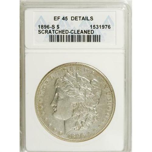 <B>1896-S $1 --Cleaned, Scratched--ANACS. XF45 Details.</B></I> NGC Census: (65/711). PCGS Population (57/1317). Mintage: 5,000,000. Numismedia Wsl. Price for NGC/PCGS coin in XF45: $236. (#7244)<BR><BR><B>Coin Engraver:</B> George T. Morgan<BR><BR><b>Shipping:</b> Coins & Currency (<a target="_blank" href="http://www.heritageauctions.com/common/shipping.php">view shipping information</a>)