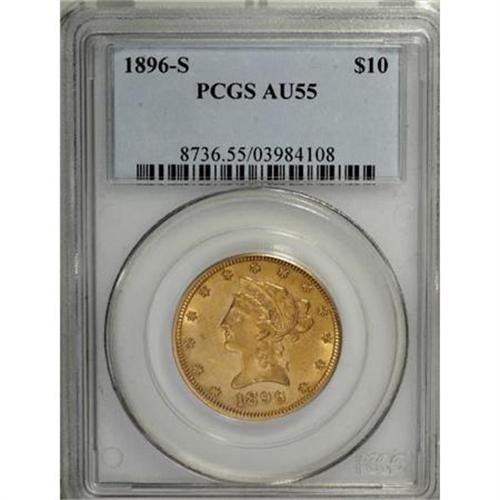 <B>1896-S $10 AU55 PCGS.</B></I> . PCGS Population (31/109). NGC Census: (80/168). Mintage: 123,750. Numismedia Wsl. Price for NGC/PCGS coin in AU55: $455. (#8736)<BR><BR><B>Coin Engraver:</B> Christian Gobrecht<BR><BR><b>Shipping:</b> Coins & Currency (<a target="_blank" href="http://www.heritageauctions.com/common/shipping.php">view shipping information</a>)