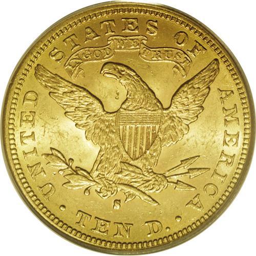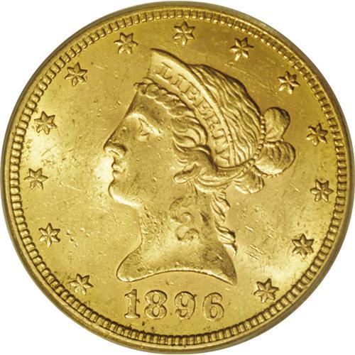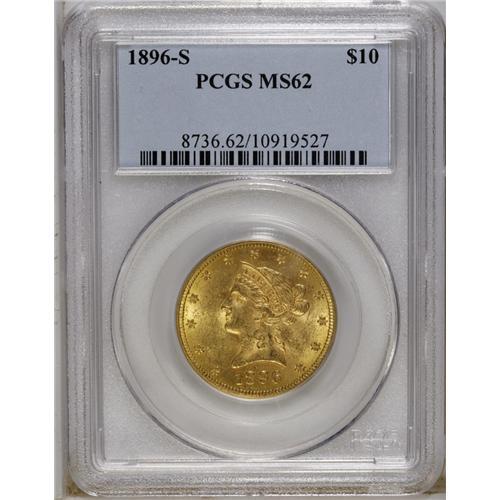 <B>1896-S $10 MS62 PCGS.</B></I> A fully lustrous and original example of this difficult Liberty ten issue. The obverse is moderately abraded, while the reverse is generally clean. Among the post-Carson City issues, the 1896-S is perhaps the rarest in Mint State. Population: 37 in 62, 5 finer (12/06).<BR><BR><b>Shipping:</b> Coin/Currency (<a target="_blank" href="http://www.heritageauctions.com/common/shipping.php">view shipping information</a>)
