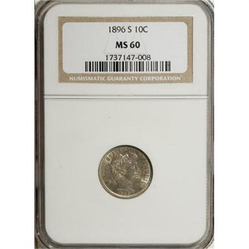 <B>1896-S 10C MS60 NGC.</B></I> NGC Census: (1/41). PCGS Population (0/52). Mintage: 575,056. Numismedia Wsl. Price for NGC/PCGS coin in MS60: $620. (#4811)<BR><BR><B>Coin Engraver:</B> Charles E. Barber<BR><BR><b>Shipping:</b> Coins & Currency (<a target="_blank" href="http://www.heritageauctions.com/common/shipping.php">view shipping information</a>)