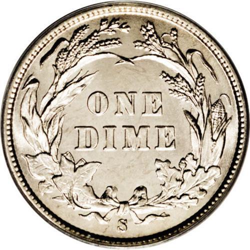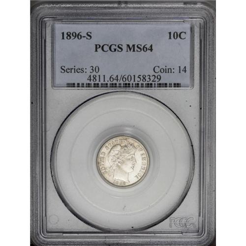 <B>1896-S<10C> MS64 PCGS.</B></I> Essentially untoned with needle sharp definition over the major devices and striated fields that produce scintillating luster. Only under close examination do a few pinpoint blemishes on and before Liberty's cheek come into play. The 1896-S dime boasts a comparatively low mintage of 575,056 pieces and is not only scarce in it own right, but also has the added advantage of a well-known rarity in the quarter series. Population: 21 in 64, 14 finer (3/06).