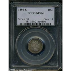 <table><tr><td><TABLE cellSpacing=0 cellPadding=0 width="100%" bgColor=#000000 border=0><TBODY> <TR><TD width="100%"><TABLE cellSpacing=1 cellPadding=3 width="100%" border=0><TBODY><TR><TD width="100%" bgColor=#79735c><FONT face=arial color=#ffffff size=3><B>Description</B> </FONT></TD></TR><TR><TD width="100%" bgColor=#ffffff><FONT face=arial size=2><B>1896-S 10C MS64 PCGS.</B></I> This is a richly toned example of this scarcer S-mint Barber dime. Fully struck, each side displays deep gray-golden and brown toning with underlying streaks of blue. A minimally abraded coin. </FONT></TD></TR></TBODY></TABLE></TD></TR></TBODY></TABLE><BR><A name=PricesRealized></A><TABLE cellSpacing=0 cellPadding=0 width="100%" bgColor=#000000 border=0><TBODY><TR><TD width="100%"><TABLE cellSpacing=1 cellPadding=3 width="100%" border=0><TBODY><TR><TD width="100%" bgColor=#79735c><A name=PR><FONT face=arial color=#ffffff size=3><B>Previous Prices from Heritage Auctions</B> </FONT></A></TD></TR><TR><TD bgColor=#f6f6ed><TABLE cellSpacing=0 cellPadding=0 width="100%" border=1><TBODY><TR><TD align=middle width="33%"><B>Date</B></TD><TD align=middle width="33%"><B>Service</B></TD><TD align=middle width="33%"><B>Price</B></TD></TR><TR bgColor=whitesmoke><TD width="33%"><B>03/13/2001</B></TD><TD width="33%">PCGS</TD><TD width="33%">$2,000.00</TD></TR><TR bgColor=whitesmoke><TD width="33%"><B>05/03/2003</B></TD><TD width="33%">PCGS</TD><TD width="33%">$2,012.50</TD></TR><TR bgColor=whitesmoke><TD width="33%"><B>03/01/2003</B></TD><TD width="33%">PCGS</TD><TD width="33%">$1,800.90</TD></TR><TR bgColor=whitesmoke><TD width="33%"><B>06/10/2000</B></TD><TD width="33%">NGC</TD><TD width="33%">$1,955.00</TD></TR><TR bgColor=whitesmoke><TD width="33%"><B>04/23/1999</B></TD><TD width="33%">PCGS</TD><TD width="33%">$2,242.50</TD></TR><TR bgColor=whitesmoke><TD width="33%"><B>08/07/1998</B></TD><TD width="33%">NGC</TD><TD width="33%">$2,875.00</TD></TR><TR bgColor=whitesmoke><TD width="33%"><B>08/07/1998</B></TD><TD width="33%">PCGS</TD><TD width="33%">$2,300.00</TD></TR><TR bgColor=whitesmoke><TD width="33%"><B>08/01/1996</B></TD><TD width="33%">PCGS</TD><TD width="33%">$2,640.00</TD></TR></TBODY></TABLE></TD></TR><TR><TD bgColor=#ffffff><FONT face=arial size=1 ?>PLEASE NOTE: All prices realized reflect the final hammer price PLUS the buyer's premium in auctions that charge a buyer's premium. Each item has a notation at the top of the listing indicating whether that lot included a buyer's premium. Example: A item that sells with a final hammer price of $100 and a 20% buyer's premium will display with a price realized of $120. All information listed is intended to be as accurate as possible, but errors are possible. Please use this guide carefully and inform us of any inaccuracies. </FONT></TD></TR></TBODY></TABLE></TD></TR></TBODY></TABLE><BR><TABLE cellSpacing=0 cellPadding=0 width="100%" bgColor=#000000 border=0><TBODY><TR><TD width="100%"><TABLE cellSpacing=1 cellPadding=3 width="100%" border=0><TBODY><TR><TD width="100%" bgColor=#79735c colSpan=6><FONT face=arial color=#ffffff size=3><B>Price Guide*</B> </FONT></TD></TR><TR bgColor=#f6f6ed><TD align=middle><B>Grade</B> </TD><TD align=middle><B>Coin World<BR>(Trends)</B> </TD><TD align=middle><B>Numismedia<BR>Retail</B> </TD><TD align=middle><B>Numismedia<BR>Wholesale</B> </TD><TD align=middle><B>Coin<BR>Universe</B> </TD><TD align=middle><B>Heritage<BR>Value Index</B> </TD></TR><TR bgColor=#ffffff><TD align=middle>63</TD><TD align=right>$1,650.00</TD><TD align=right>---</TD><TD align=right>$1,325.00</TD><TD align=right>$1,350.00</TD><TD align=right>$1,015.00</TD></TR><TR style="FONT-WEIGHT: bold" bgColor=#cccfdd><TD align=middle>64</TD><TD align=right>$3,250.00</TD><TD align=right>---</TD><TD align=right>$2,150.00</TD><TD align=right>$2,600.00</TD><TD align=right>$1,901.48</TD></TR><TR bgColor=#ffffff><TD align=middle>65</TD><TD align=right>$3,750.00</TD><TD align=right>---</TD><TD align=right>$2,650.00</TD><TD align=right>$3,750.00</TD><TD align=right>$2,482.50</TD></TR><TR bgColor=#ffffff><TD colSpan=6><FONT size=1>*All information listed is intended to be as accurate as possible, but errors are possible. No item may be returned or refused based on this information which is provided as a service to our customers. You should contact each pricing source directly to determine the accuracy of this information. </FONT></TD></TR></TBODY></TABLE></TD></TR></TBODY></TABLE><BR><TABLE cellSpacing=0 cellPadding=0 width="100%" bgColor=#000000 border=0><TBODY><TR><TD width="100%"><TABLE cellSpacing=1 cellPadding=3 width="100%" border=0><TBODY><TR><TD width="100%" bgColor=#79735c><FONT face=arial color=#ffffff size=3><B>Population Guide</B> </FONT></TD></TR><TR bgColor=#ffffff><TD align=middle><!-- Begin Output of Population Grid--><TABLE cellSpacing=0 cellPadding=0 width="100%" border=0><TBODY><TR><TD vAlign=center><TABLE cellSpacing=0 width="100%" border=1 cellsadding="3"><TBODY><TR><TD vAlign=center><TABLE cellSpacing=0 cellPadding=3 width="100%" border=1><TBODY><TR><TD vAlign=center align=middle bgColor=#f0f1e8 colSpan=2 <CENTER><FONT face=Arial size=2><B>PCGS Pop </B></FONT><CENTER></CENTER></TD><TD vAlign=center align=middle bgColor=#f0f1e8 colSpan=2><CENTER><FONT face=Arial size=2><B>NGC Pop</B></CENTER></FONT></TD></TR><TR><TD vAlign=center><FONT face=Arial size=2>(64)</FONT> </TD><TD vAlign=center align=right><FONT face=Arial size=2>14</FONT> </TD><TD vAlign=center><FONT face=Arial size=2>(64)</FONT> </TD><TD vAlign=center align=right><FONT face=Arial size=2>11</FONT> </TD></TR><TR><TD vAlign=center><FONT face=Arial size=2>(>64)</FONT> </TD><TD vAlign=center align=right><FONT face=Arial size=2>16</FONT> </TD><TD vAlign=center><FONT face=Arial size=2>(>64)</FONT> </TD><TD vAlign=center align=right><FONT face=Arial size=2>15</FONT> </TD></TR></TBODY></TABLE></TD></TR></TBODY></TABLE></TD></TR></TBODY></TABLE><!-- End Output of Population Grid--></TD></TR></TBODY></TABLE></TD><