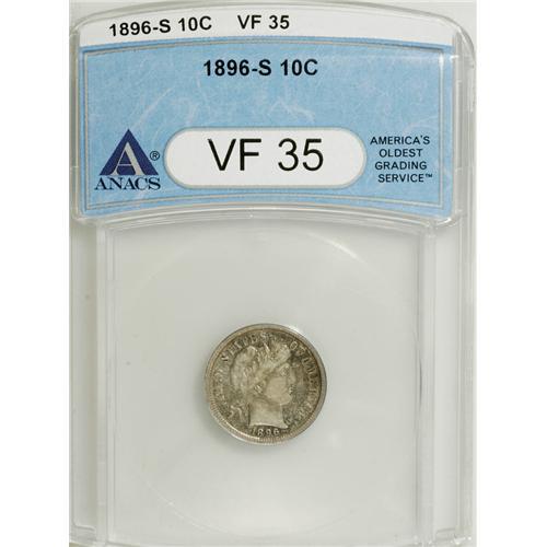 <B>1896-S 10C VF35 ANACS.</B></I> NGC Census: (3/55). PCGS Population (5/67). Mintage: 575,056. Numismedia Wsl. Price: $306. (#4811)<BR><BR><b>Shipping:</b> Coins & Currency (<a target="_blank" href="http://www.heritageauctions.com/common/shipping.php">view shipping information</a>)