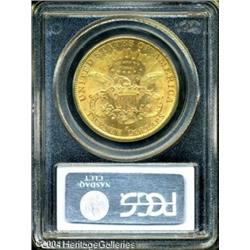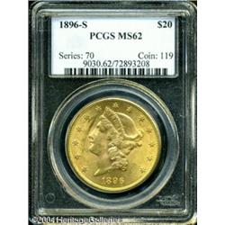 1896-S $20 MS62 PCGS. Boldly struck and highly lus <B>1896-S $20 MS62 PCGS.</B></I> Boldly struck and highly lustrous, with good color and a few scattered surface marks. An unfortunate scrape, in the upper left obverse field, limits the numerical grade assessment. <BR><BR><B>Important notice:</B> Heritage usually auctions material at the rate of 200-250 lots per hour. On some occasions eBay Live bid software or the Internet may not be able to keep up with the pace of the auction. We recommend placing a realistic absentee bid now as insurance to avoid disappointment. Occasionally the auctioneer may eliminate or reject an eBay Live bid, and the auctioneer may also reopen a lot after the close of the eBay live bidding (usually because we missed an audience bid), and may reject your bid even if it shows you as the winning bidder. By bidding via eBay Live, you agree that Heritage may award the lot to another bidder at its sole discretion under the circumstances described above or any other reasonable circumstances. Since eBay bids are not shown to us until we open the lot on the floor, we treat those bids just like floor bids. In most cases the floor responds before the eBay bid is presented to us, due to Internet lag time, so for consistency we have made it a policy that floor bids are always considered first over tie eBay live bids. Also please note that all Heritage lots purchased through eBay Live carry a 20% Buyer's Premium. Please make sure you read the Terms and Conditions before you bid. This lot is being auctioned in conjunction with a live floor auction by Heritage Galleries & Auctioneers. All final auction and invoice information will be supplied by Heritage Galleries & Auctioneers, and all other information should be considered preliminary. Lot:6973