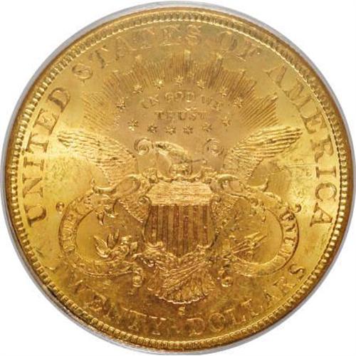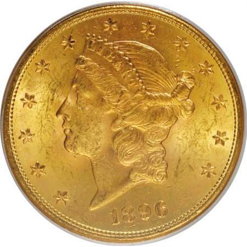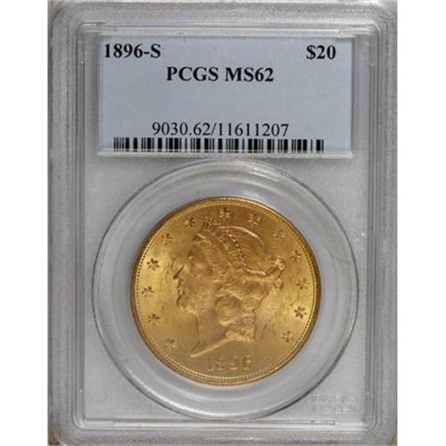 <B>1896-S $20 MS62 PCGS.</B></I> PCGS Population (1845/943). NGC Census: (2469/735). Mintage: 1,403,925. Numismedia Wsl. Price for NGC/PCGS coin in MS62: $755. (#9030)<BR><BR><B>Coin Engraver:</B> James B. Longacre<BR><BR><b>Shipping:</b> Coins & Currency (<a target="_blank" href="http://www.heritageauctions.com/common/shipping.php">view shipping information</a>\)