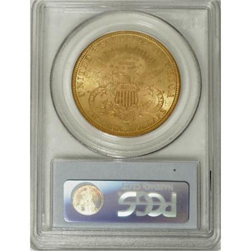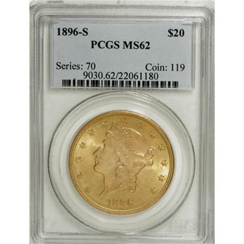 <B>1896-S $20 MS62 PCGS.</B></I> PCGS Population (1916/969). NGC Census: (2484/741). Mintage: 1,403,925. Numismedia Wsl. Price for NGC/PCGS coin in MS62: $740. (#9030)<BR><BR><B>Coin Engraver:</B> James B. Longacre<BR><BR><b>Shipping:</b> Coins & Currency (<a target="_blank" href="http://www.heritageauctions.com/common/shipping.php">view shipping information</a>)