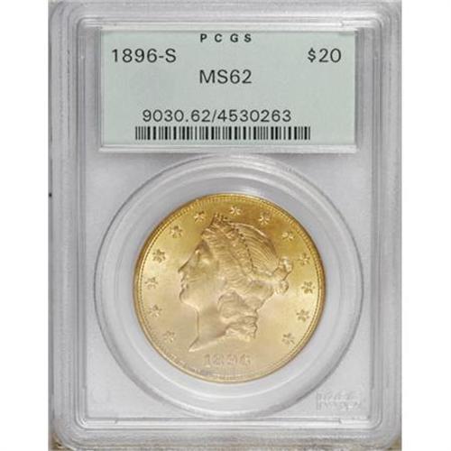 <B>1896-S $20 MS62 PCGS.</B></I> PCGS Population (1936/978). NGC Census: (2515/743). Mintage: 1,403,925. Numismedia Wsl. Price for NGC/PCGS coin in MS62: $758. (#9030)<BR><BR><B>Coin Engraver:</B> James B. Longacre<BR><BR><b>Shipping:</b> Coins & Currency (<a target="_blank" href="http://www.heritageauctions.com/common/shipping.php">view shipping information</a>)