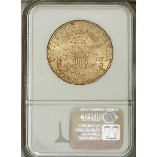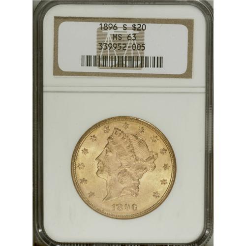 <B>1896-S $20 MS63 NGC.</B></I> Select and well struck with flecks of lavender that accent the lustrous yellow-gold surfaces. A deep copper spot is noted between the second T in STATES and the rim.<BR><BR><b>Shipping:</b> Coin/Currency (<a target="_blank" href="http://www.heritageauctions.com/common/shipping.php">view shipping information</a>)