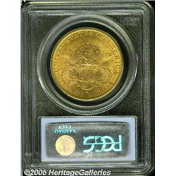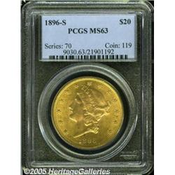 <B>1896-S $20 MS63 PCGS.</B></I> Lustrous surfaces display a peach-gold cast, and well defined motifs. Just a few too many bagmarks, especially on the obverse, preclude a higher grade. A small alloy spot is seen on each side.