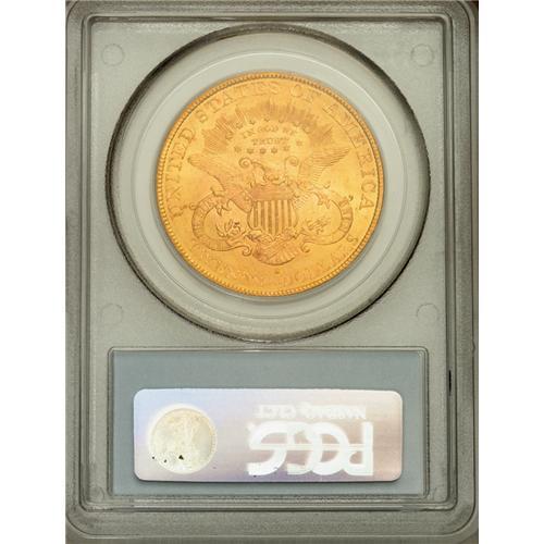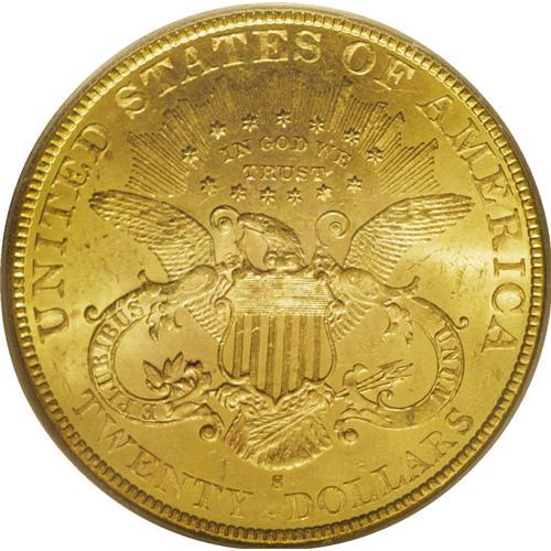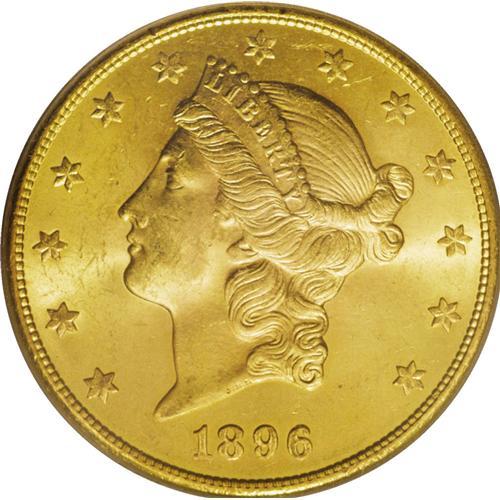 <B>1896-S $20 MS64 PCGS.</B></I> The date collector searching for the finest possible 1896-S double eagle has three choices. He can wait, perhaps a generation, until the incredible MS67 Eliasberg coin becomes available. He can wait for the single NGC-graded MS65 specimen, bearing in mind that it too may not come up for sale for years and adding that even an image of the piece may be impossible to come by. Or he can choose to bid on a coin like the present piece, an appealing MS64 specimen with bright, mostly green-gold surfaces and complete luster. The strike is a bit weak on the upper obverse stars and the denomination, yet that is not uncommon with this date. Population: 129 in 64, 1 finer (11/06).<BR><I>From The Kutasi Collection.</B></I><BR><BR><b>Shipping:</b> Coin/Currency (<a target="_blank" href="http://www.heritageauctions.com/common/shipping.php">view shipping information</a>)