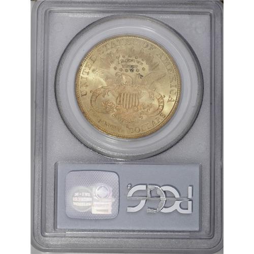 <B>1896-S $20 MS64 PCGS.</B></I> Well struck with flashy, scintillating luster and absolutely beautiful yellow-green and peach toning. Both sides show a few grade-limiting marks, and several bits of dark-green verdigris are noted on the reverse, above the eagle's head. Readily available through the Select Mint State level, this issue becomes scarce at MS64, and is nearly nonexistent any finer.<BR><BR><b>Shipping:</b> Coin/Currency (<a target="_blank" href="http://www.heritageauctions.com/common/shipping.php">view shipping information</a>)
